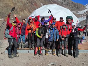 La aclimatación fue progresiva. Dos semanas aprendiendo a dar pasitos cortos, a no acelerar. Partieron desde Mendoza y cruzaron todos los puntos de la ruta más habitual: Penitentes, Confluencia, Plaza de Mulas, Nido de Cóndores… Por la cara norte, por la ruta más habitual, asomándose hasta Plaza Francia para visibilizar la técnica y desplomada ladera sur y coronar el Cerro Bonete como entrenamiento en altura.