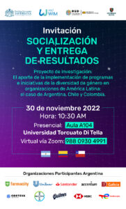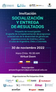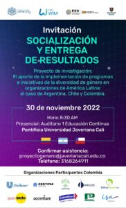 Este proyecto, que fue financiado por la Pontificia Universidad Javeriana Cali, tuvo como objetivo analizar los aportes de programas e iniciativas de gestión de la diversidad de género en 30 organizaciones en Argentina, Chile y Colombia entre las que están Grupo Éxito, Unilever, Corteva, Grupo Nutresa, Argos, Belleza Express S.A., Propal, Accenture, Isa Intervial y Colombina. Fue realizado en alianza con REDWIM, la Universidad Torcuato Di Tella-RED, la Red de Empresas por la Diversidad en Argentina y la Universidad Mayor de Chile.