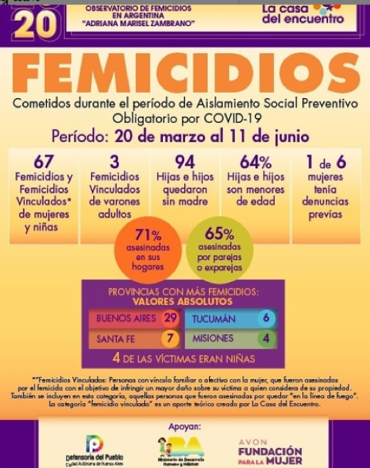 La cuarentena obligatoria se decreta en Argentina el 20 de Marzo del 2020 y sigue rigiendo para la mayoría de la población. Desde entonces, se puede lamentar el trágico número de 67 femicidios.